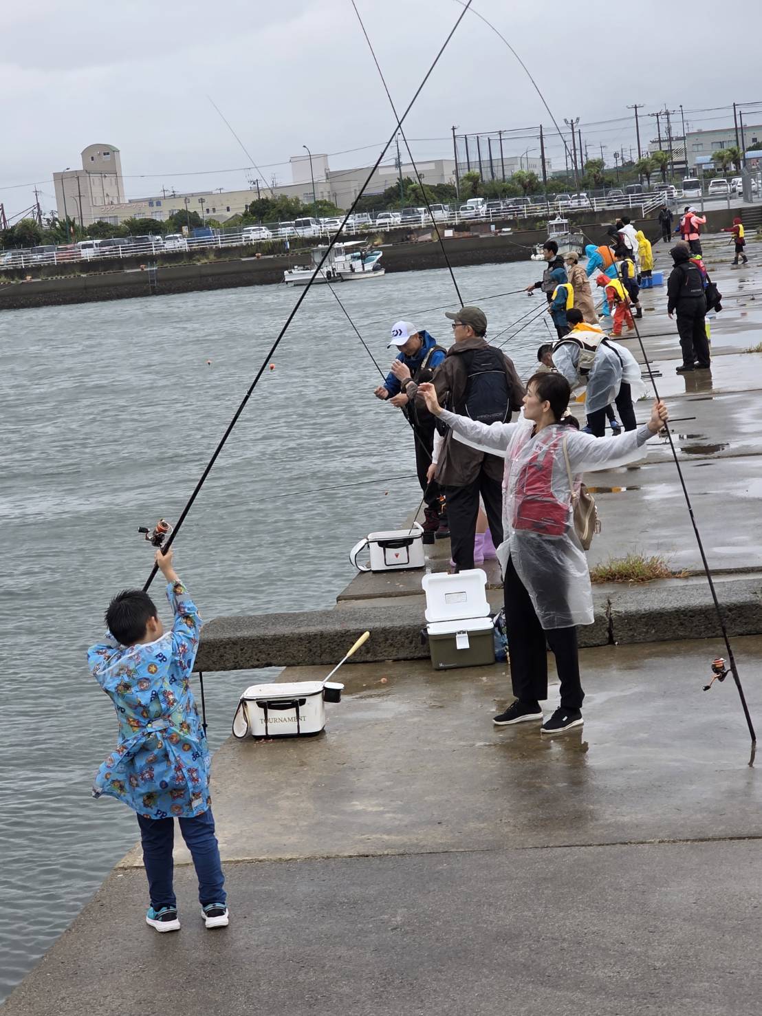 10月4日(土)、沖洲マリンピアの近くの湾内で、大人11名子供さん9名に参加して頂いた。当日の早朝は雨模様だったが、釣り開始の午前9時頃には幸いなことに雨が止んだものの、南風は強く本命の川沿いの釣り座は駄目であった。