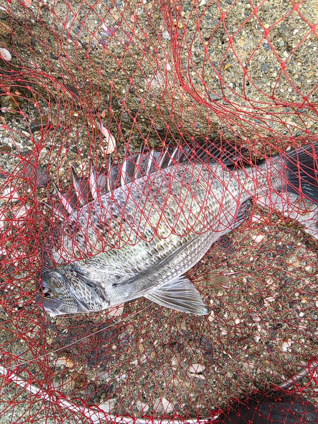今度はコッン、コッンと優しい引きをタモで掬ったのは30センチのチヌだった。暫くして、豪快に底に突っ込み慎重にやり取りして無事取り込んだのは、銀鱗が眩しく光った43センチのチヌに安堵する。