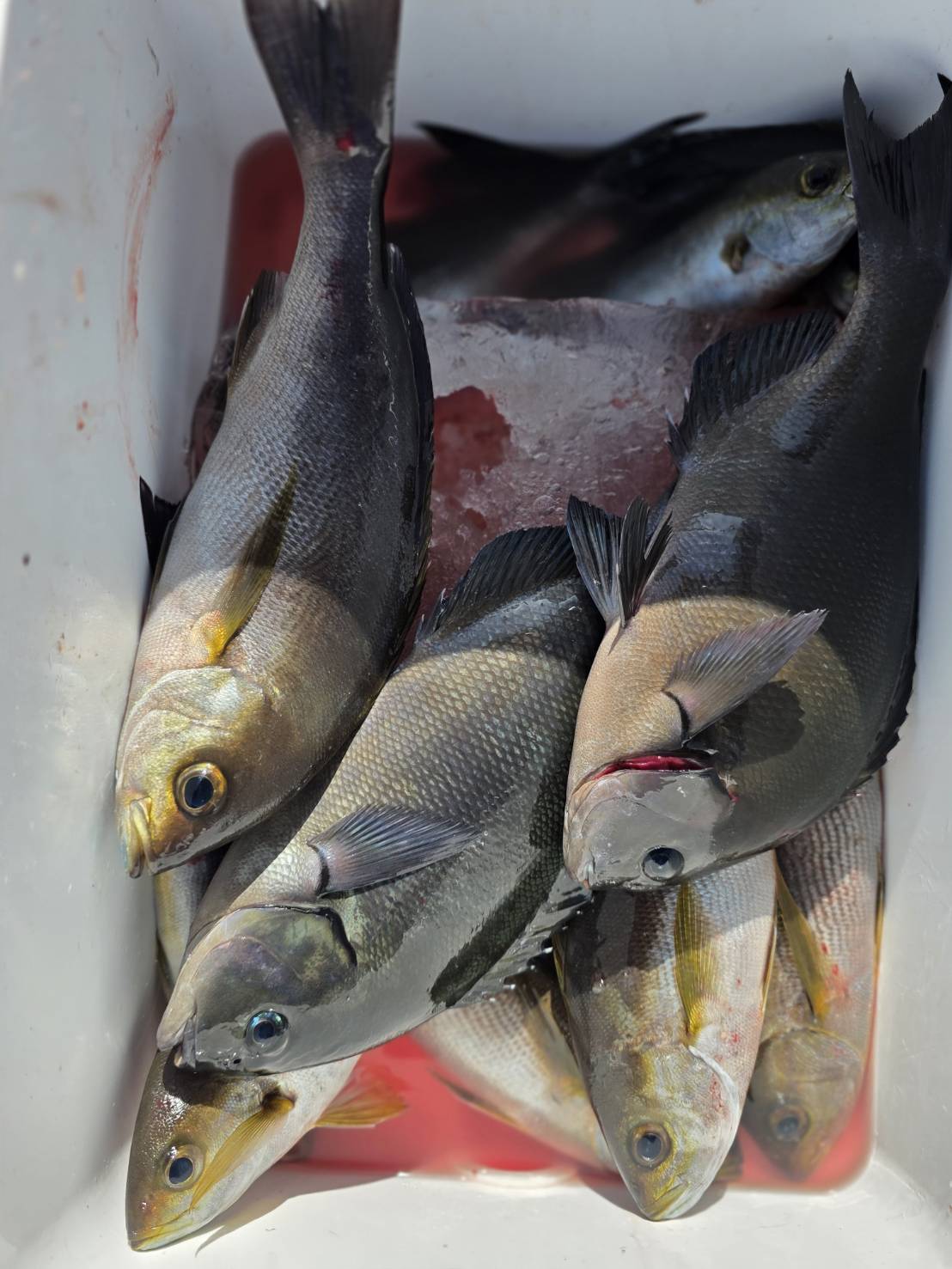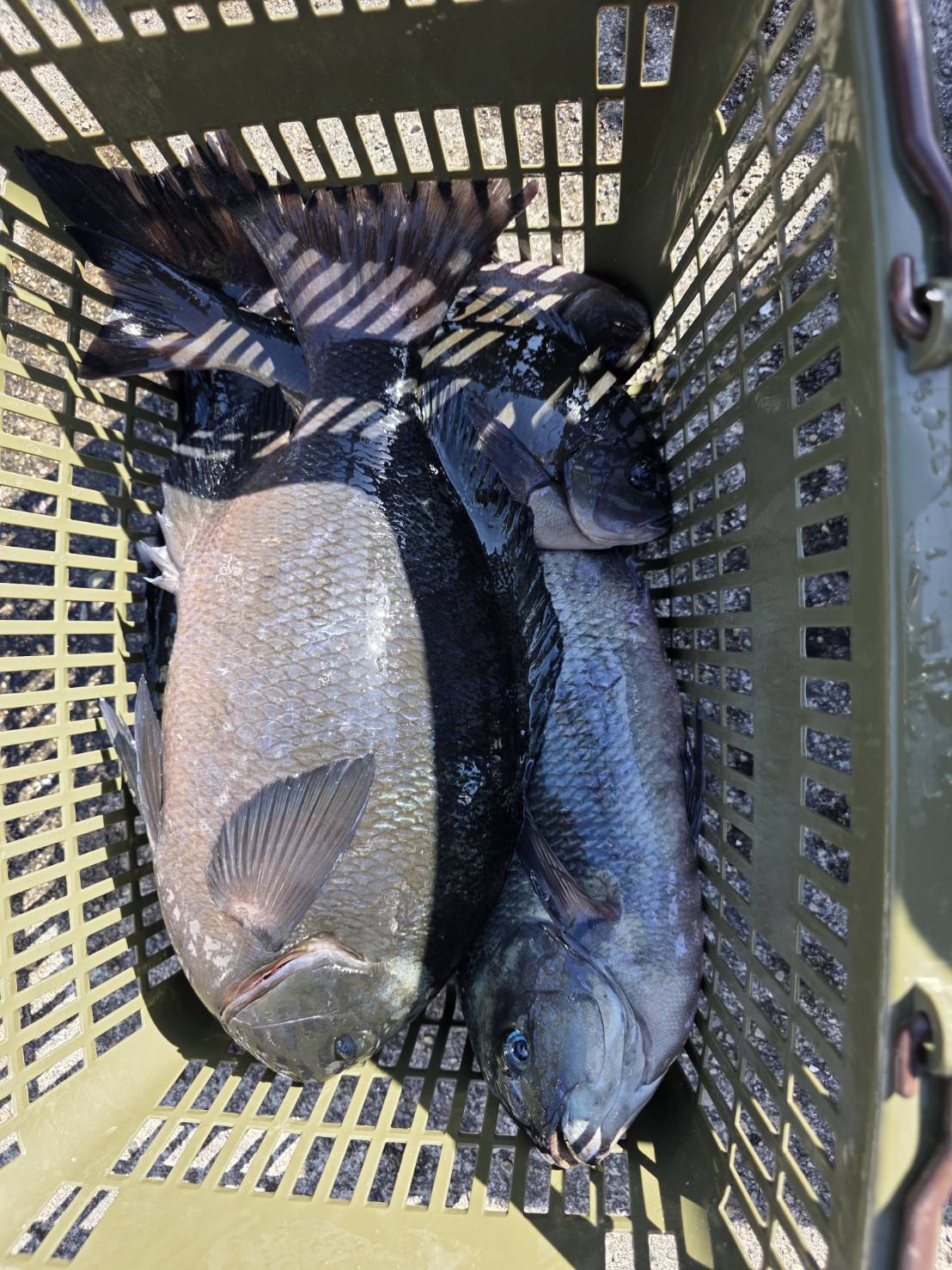船着きで釣りを開始するが3ヒロではサシエも取られず、深く探るとイサギの入れ食い。ウネリが高く遠投しても左沖の磯からの大きなサラシで仕掛けは押されて馴染まない。小さなサラシを見定めて遠投すると28センチまでの尾長グレが3匹釣れた。