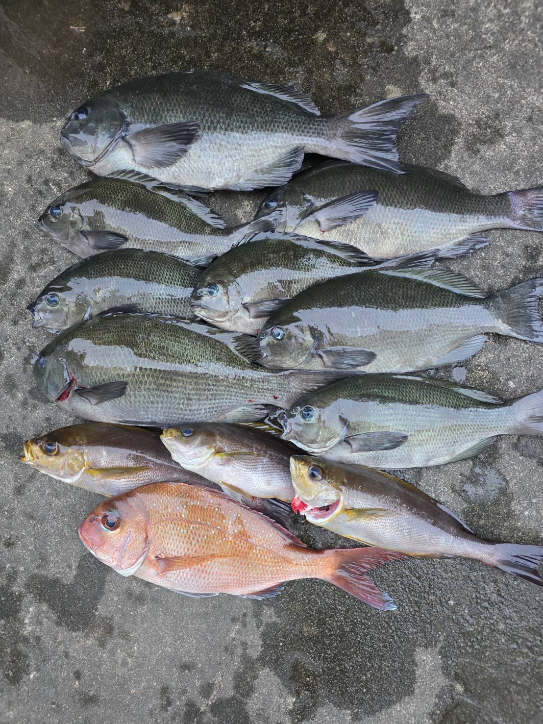 大漁とは言えないが、グレ42センチを頭に30センチを8匹、イサギ33センチ~27センチを3匹と今シーズンでは満足できる釣果だった。