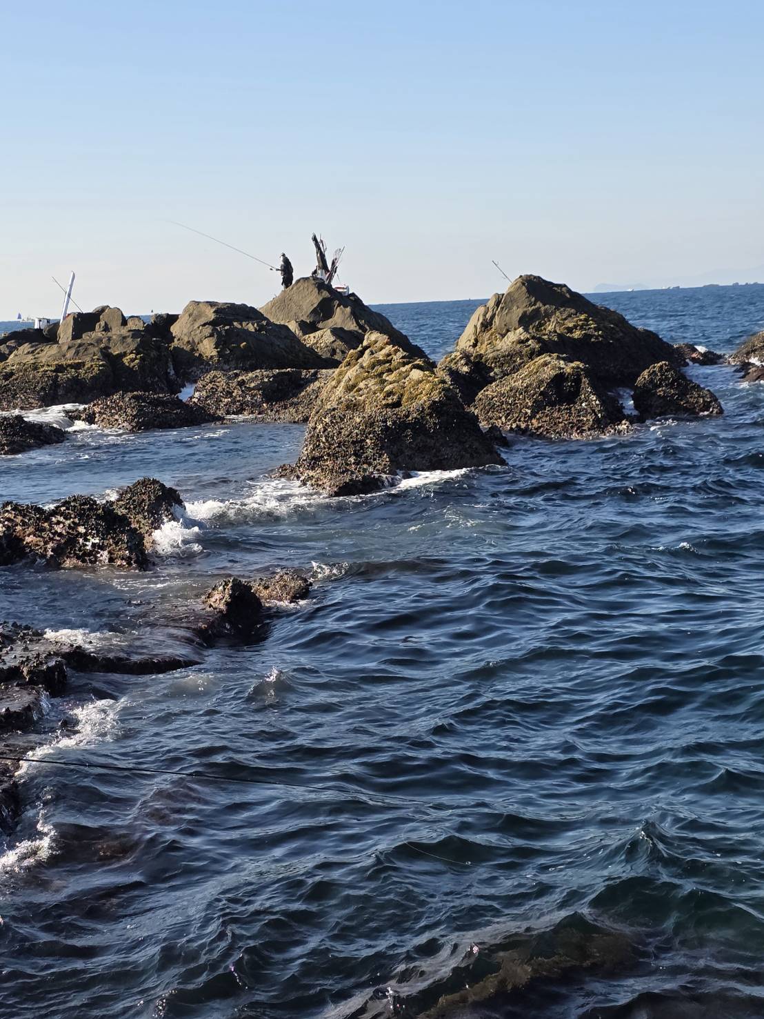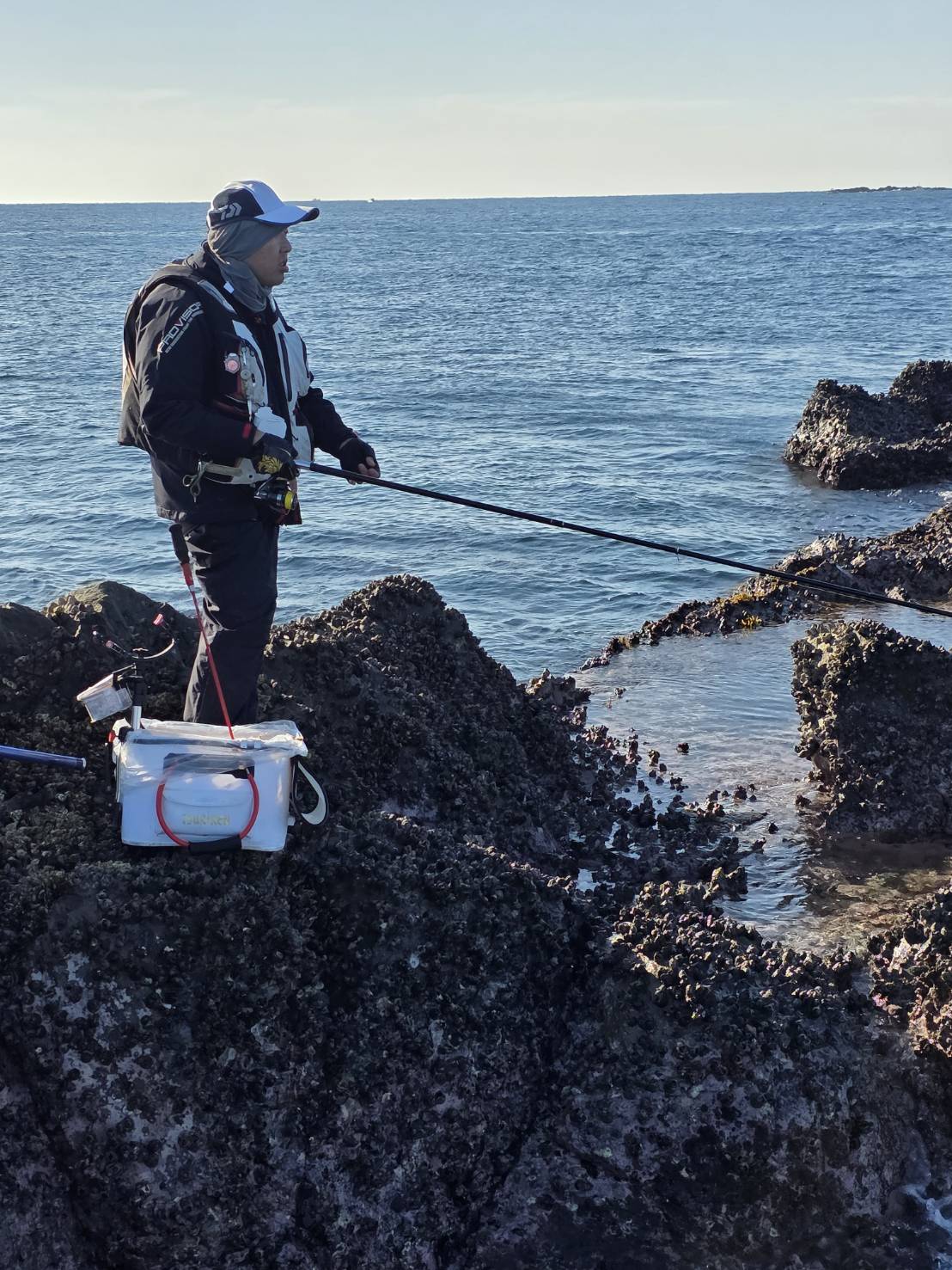 3匹が釣れた後で同行の方が潮下に来られグレやイサギを連発する。マキエは多くポイントに入るとイサギと27センチ~33センチとグレも交じりお互いに当たりがあり楽しめた。ところが、干潮になると本命の当たりは遠のいてエサ取りの猛攻で厳しくなる。