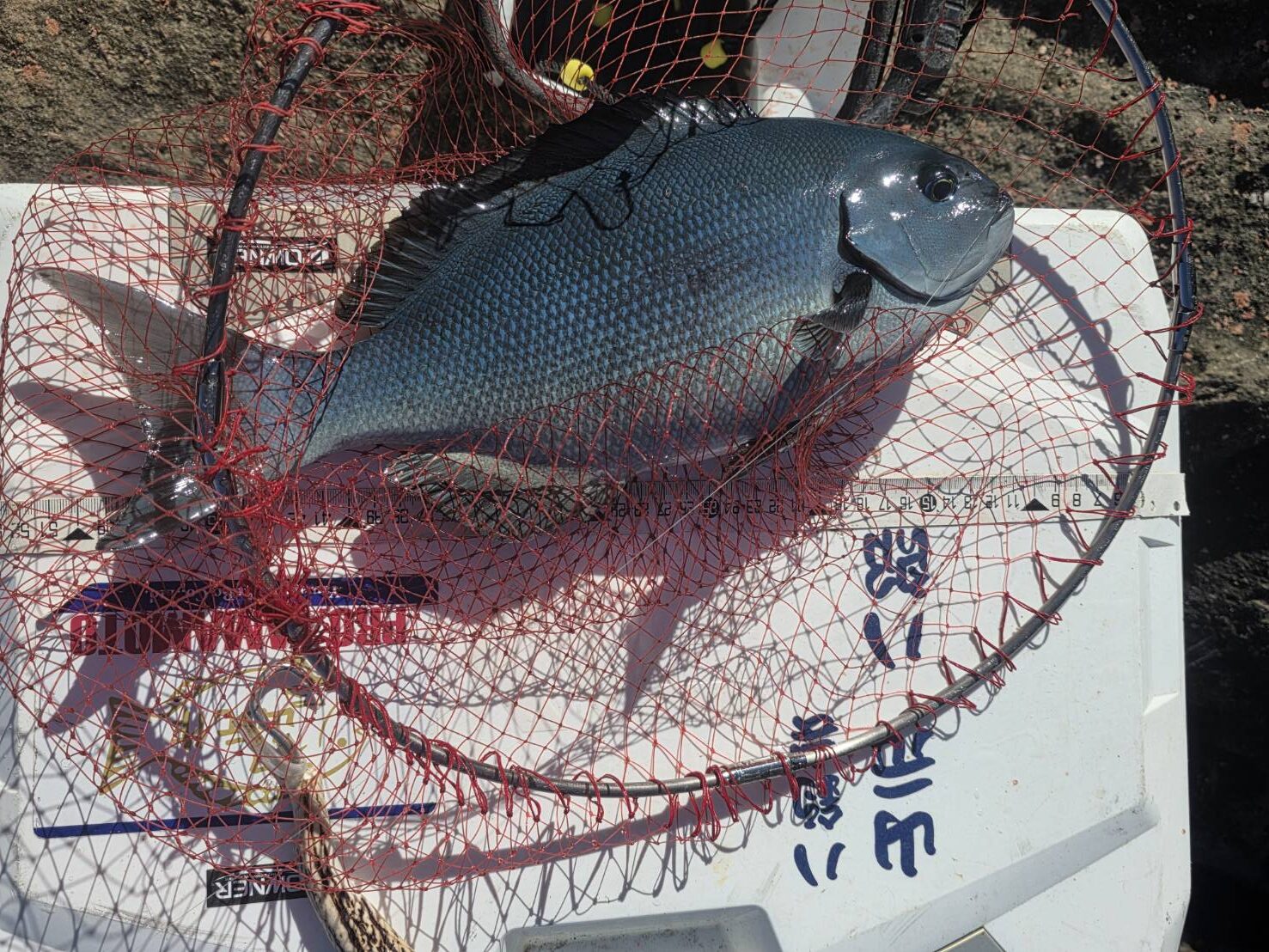 マキエに大きなボラが居たが、数投目にレギュラー【00】が気持ちよく海中に入り竿は大きく曲がる。引きも強く竿を操り何度か糸を出してタモ入れしたのは、37センチの良く肥えたグレだった。連続で当たりがあり先程より強烈で重量があり慎重にやり取りしたものの、根にハリスが触れて切られた。