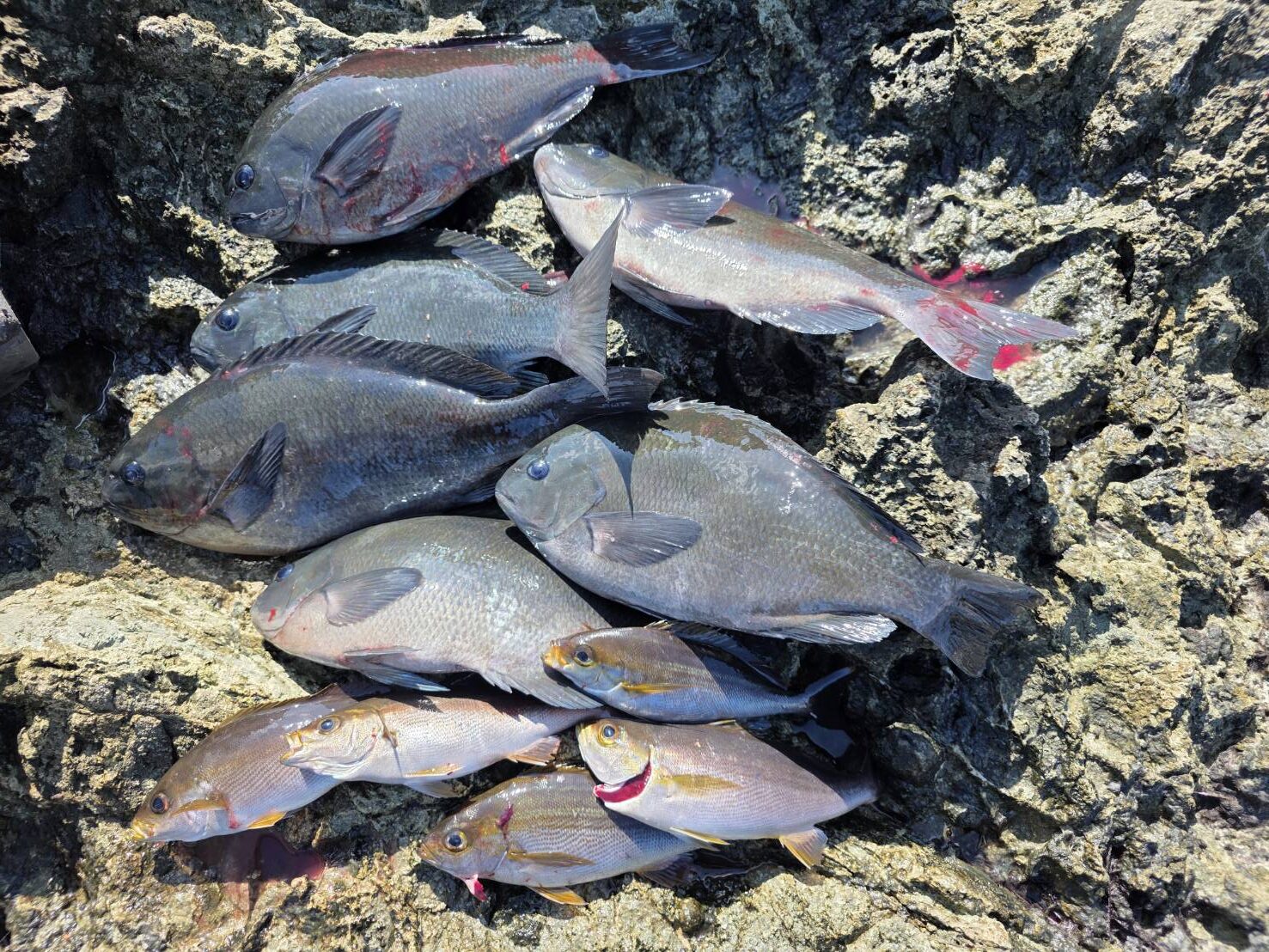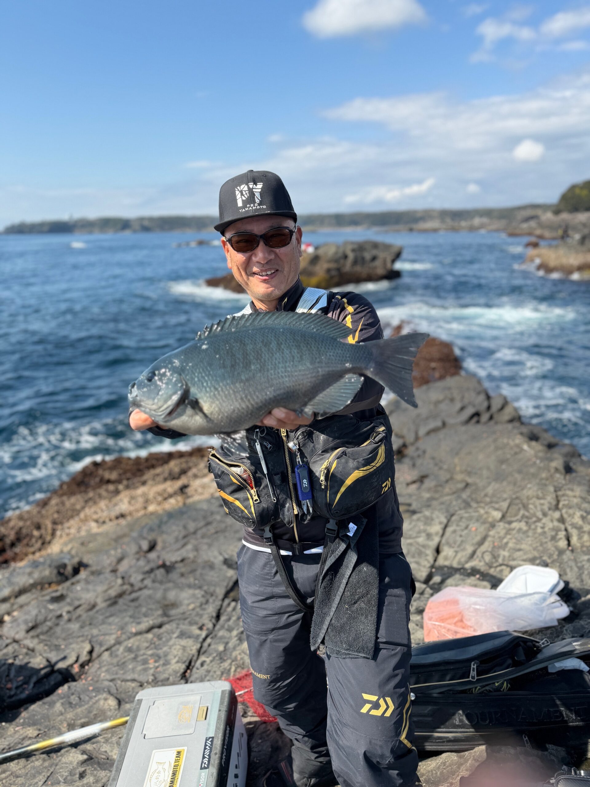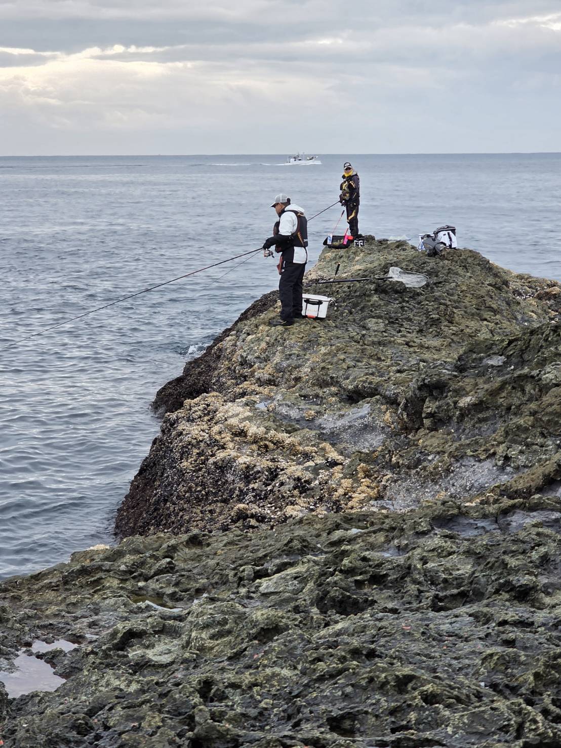 天候は曇りのち晴れ、波も風も無く暖かい釣り日和だった。私の残りクジは1-9番で前半は沖磯に1-1番から2名ずつ上がり、私はアシカバエに9番、10番、11番の3名が上がる。ホームグランドである池田翔梧さんから今日は下げ潮だからここが一番良いと教えて頂き釣り座を決める。その右側に田森弘次さん、池田さんが裏側で狙った。