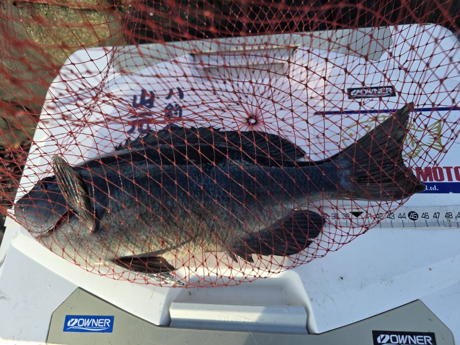 湾内の双子に3名で上がり、私は船付きで竿を出す。ベタ凪でサラシもなく穏やかで、潮も殆ど動かずタナを深く探ると30センチ弱のイサギが5匹、アイゴが2匹掛かって来た。そんな厳しい中で中央の沈み根を狙っていた楠木さんが終了間際に35センチのグレを掛けたのは見事だった。