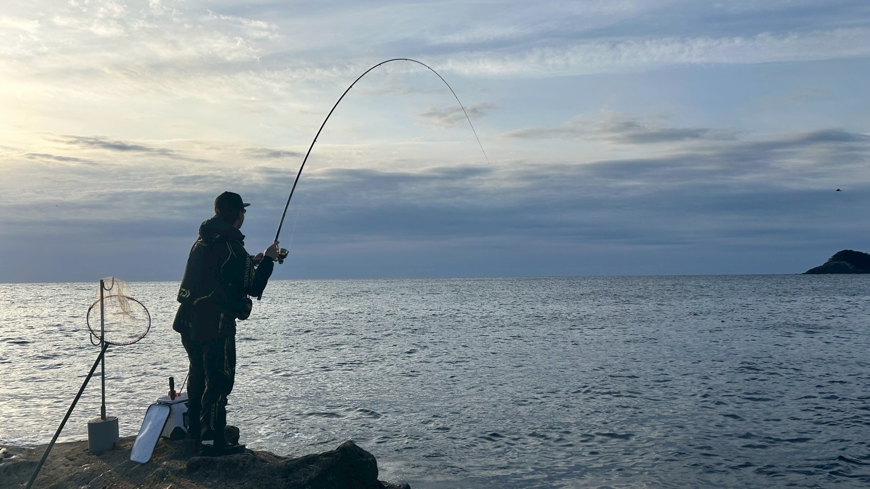 朝イチは足場が低くくて、海面がぎらついてウキが見えにくいので海面スレスレになるゼロスタイルE01でアタリをとりました。