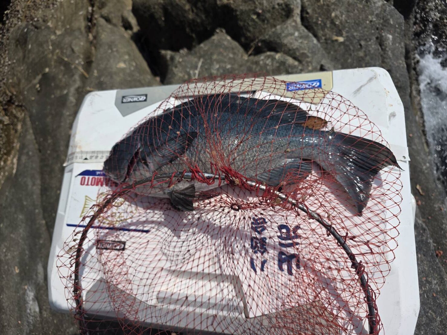次の当たりは根に入られないように注意してやり取りを繰り返し、タモで掬ったのは45センチのグレに安堵する。マキエにはキツがワンサと居たが深く探ってもサシエは残り、ハリス1号に落とし速手グレ3号で試すと豪快な当たりがあった。