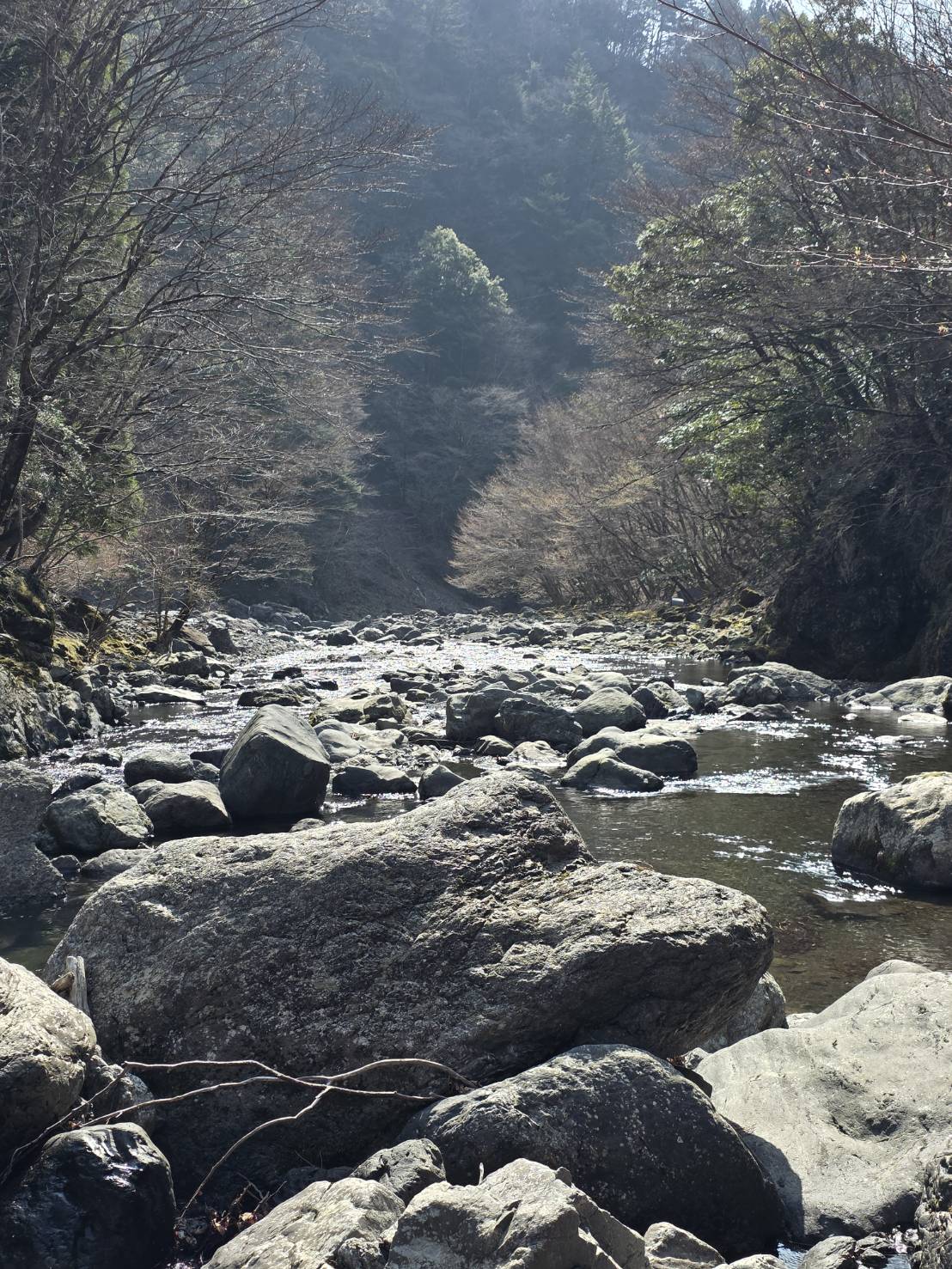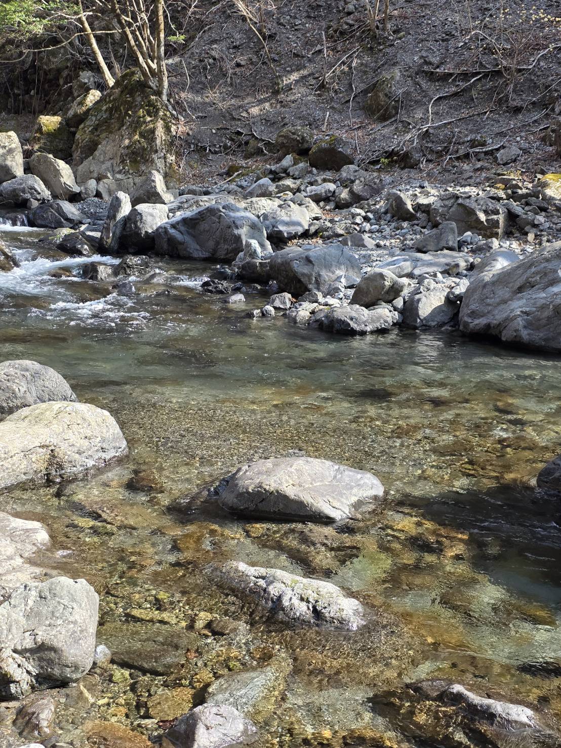上に移動しながら釣って行くと良い場所では3匹~2桁追加出来た。ところが、川を横切った足跡があり、その上の淵ではコッとした当たりが一回あっただけでハリに掛からない。次の良さそうなポイントもエサも取られず、厳しいと判断して車で上に移動する。