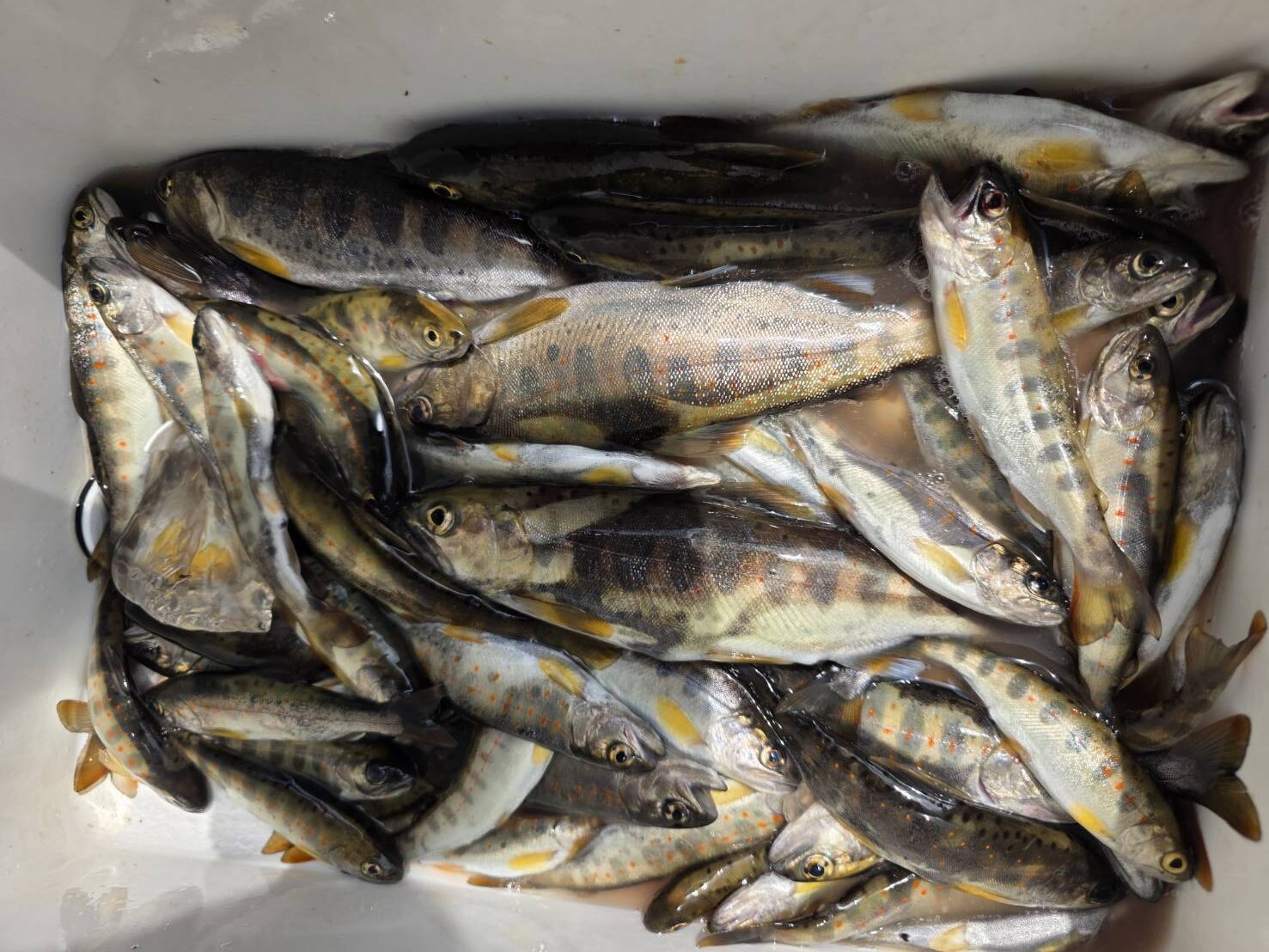 まだ午前10時過ぎなのでもう一カ所の降りにくい釣り場に行くと、誰も入ってなく何処でも当たりがあり入れ喰いだった。午後12時30分まで釣って合計118匹の大漁で渓流釣りを満喫した釣行となり、夕食は天ぷらや塩焼で美味しく頂いた。