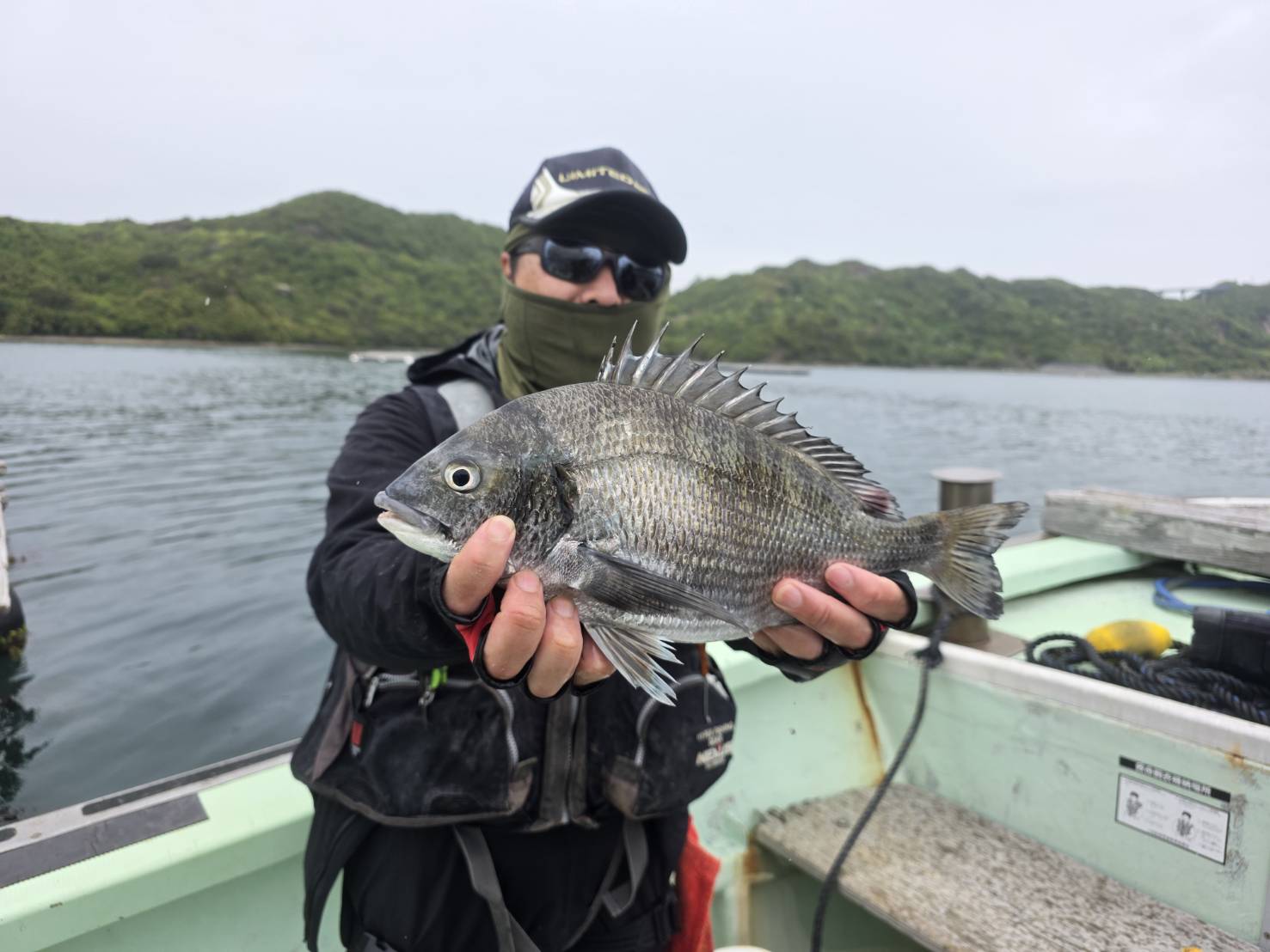 暫くして下げ潮が南に動き、釣り座も移動して入れ食いでは無いがコンスタントに追加出来たが、太陽の日射しが強くて汗をかいて、レインウェアを脱ぎ反対側のテントの影で狙うことにした。