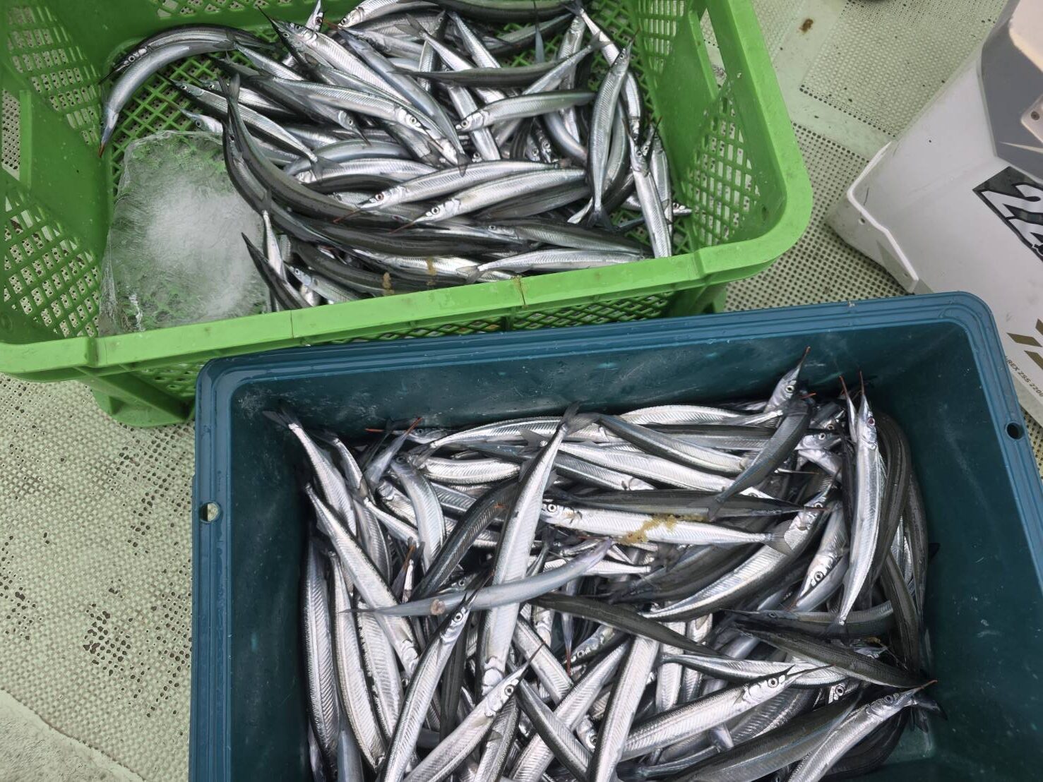 すると、流れも異なりマキエにはサヨリの群れが沢山集まり食い状態になった。中には30センチ~35センチも数匹交じり面白く夢中でマキエを撒き竿を振り、次から次と手返し良くクーラーに入れた。